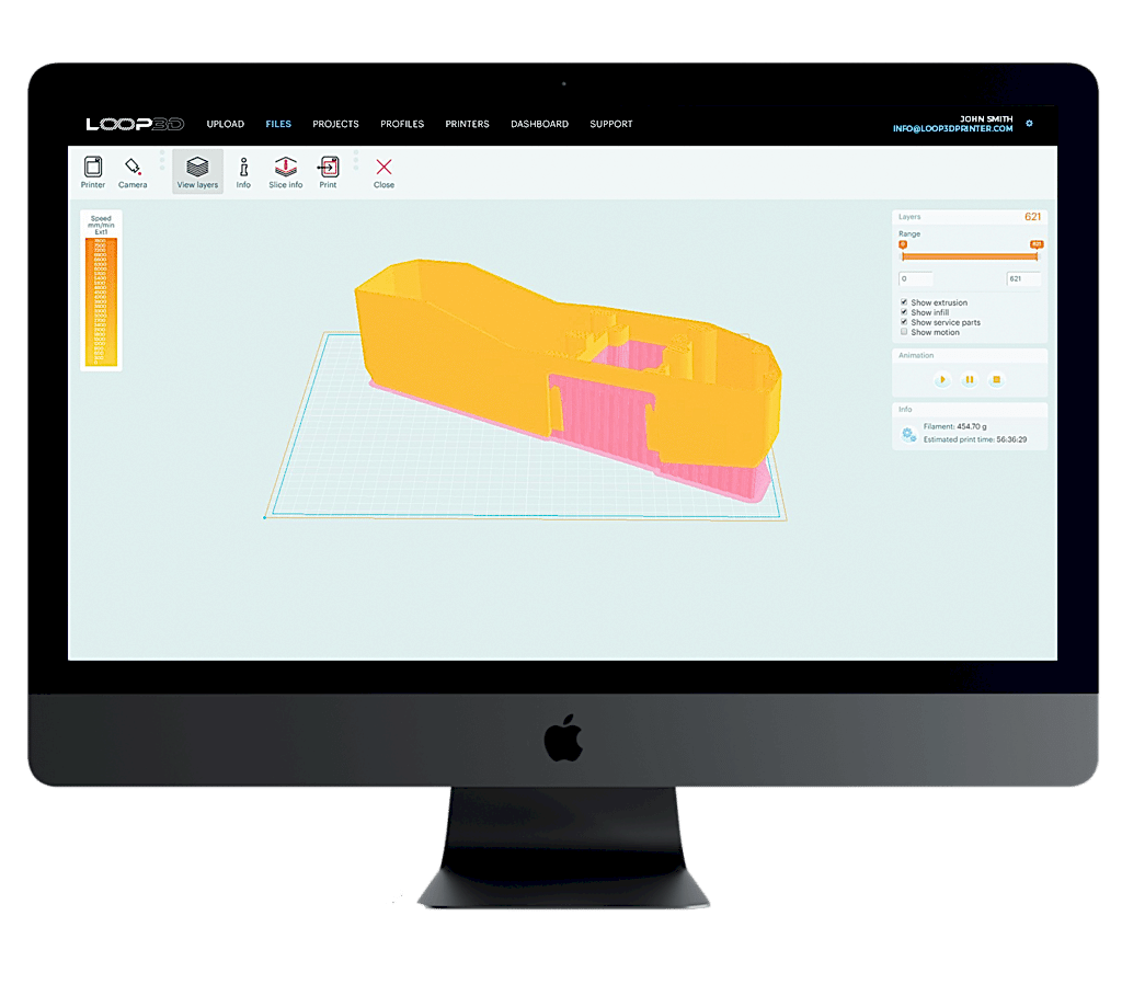 LOOP 3D CLOUD, 3D modellerinize bulut sisteminde slice işlemini yapmaya izin veren gelişmiş, kullanıcı dostu ve dokunmatik ekranda kullanıma uygun bir yazılımdır.